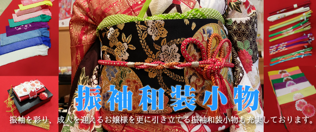 振袖和装小物もこだわります。セットのみならず、単品でも販売しております。ママ振り・姉振りなどの小物合わせは、ぜひお任せください。