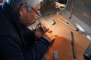 彫り始めから、終りまで同じ大きさの孔を彫り続けます。極紋の場合、一寸四方に900もの孔を彫り、型彫に一か月以上かかることもあります。