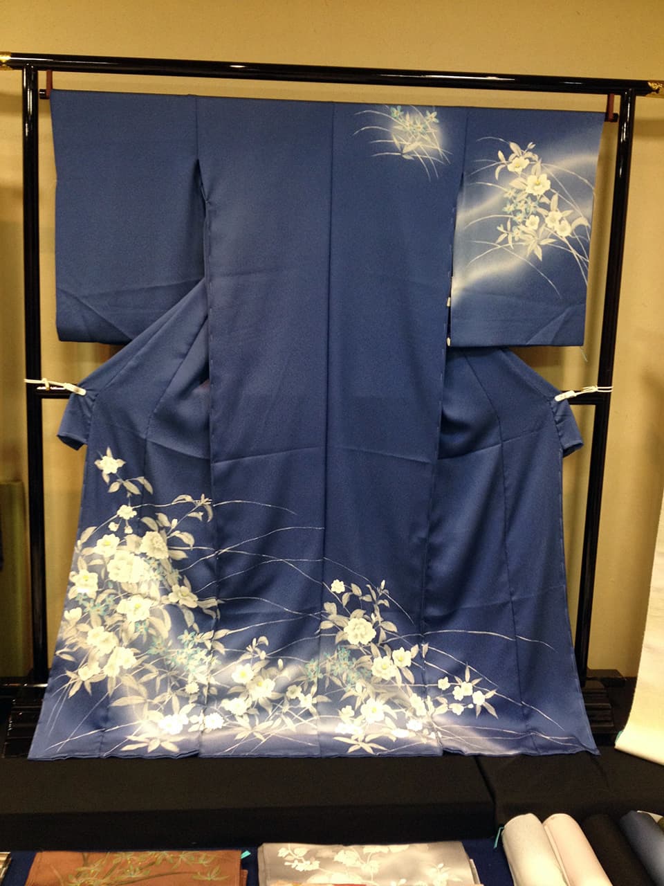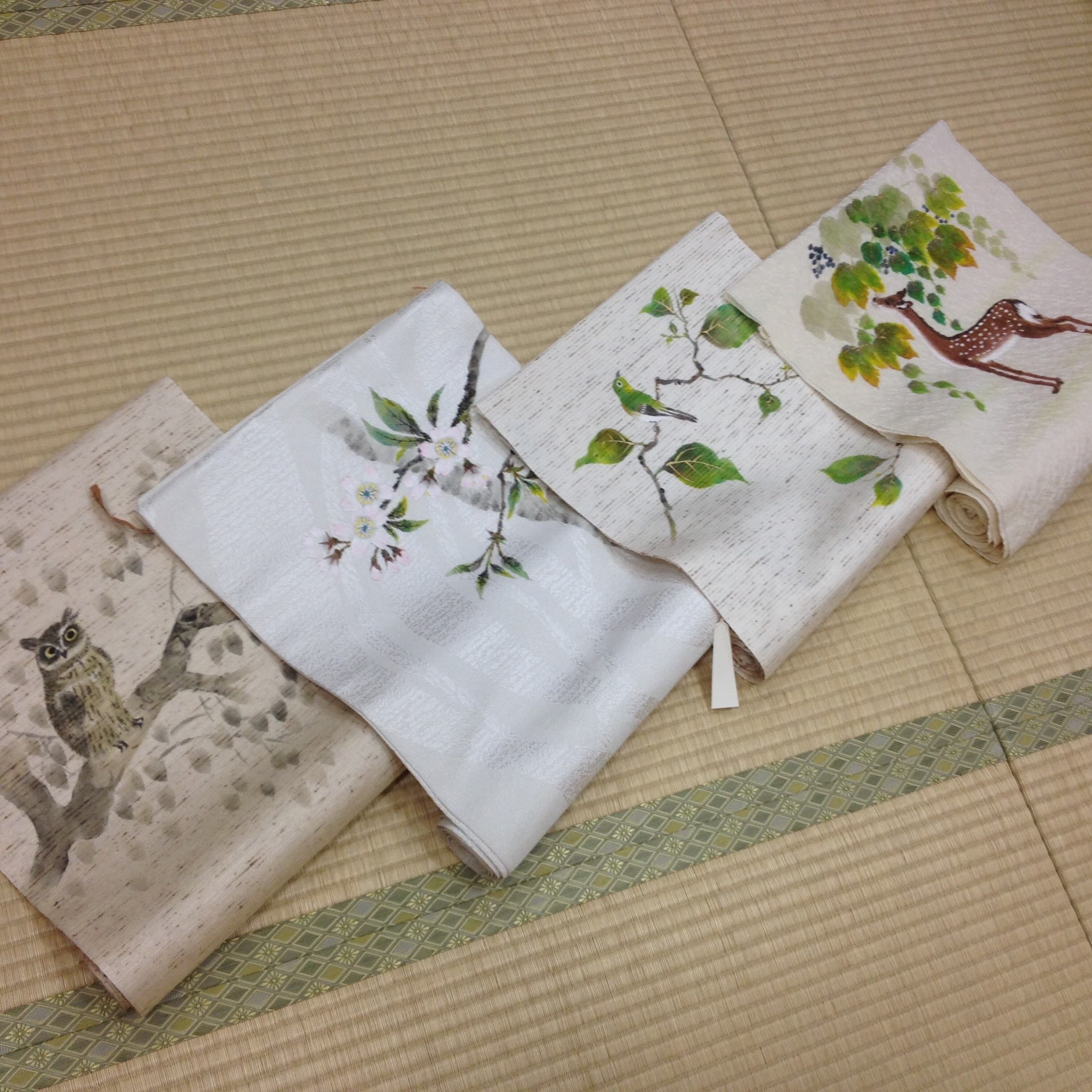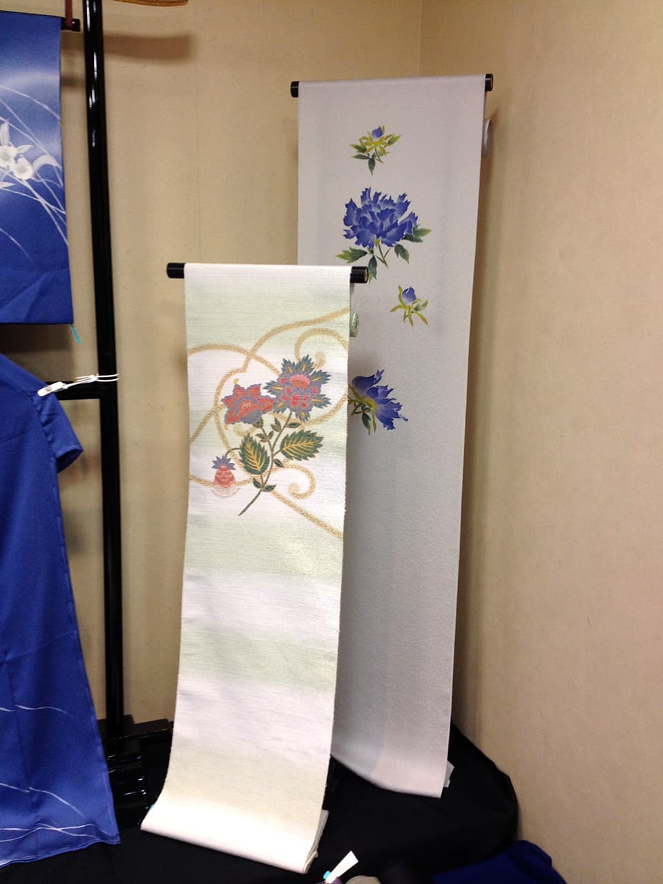 中村勝雲氏は、野や山の自然豊かな風景を切り取り、草花などをスケッチし、染色の技法を用いて図案から染めまでの工程をお一人で制作されます。