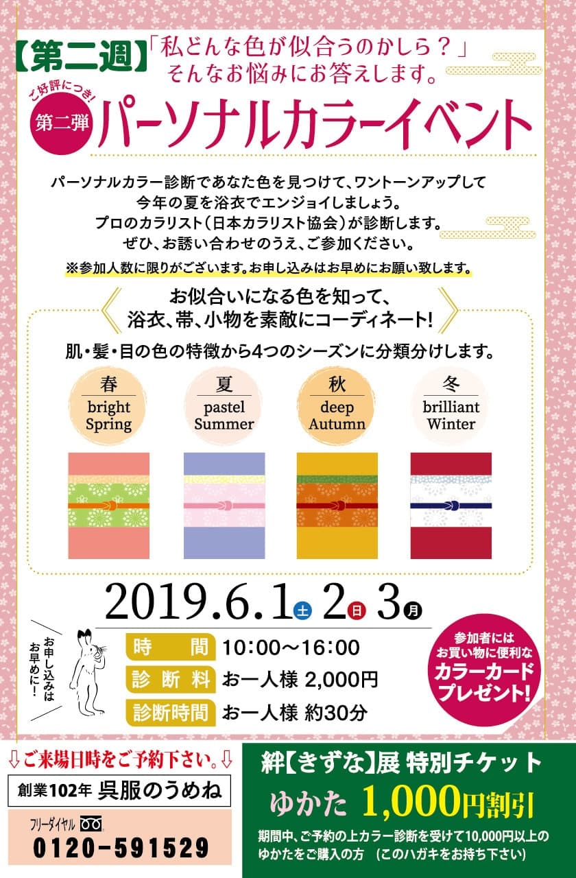 カラー診断後、浴衣をお買上の方、こちらのページの提示でゆかた1000円割引!